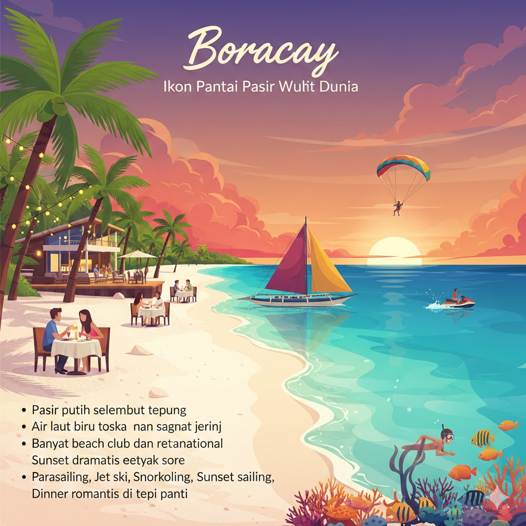 Boracay cocok untuk honeymoon, liburan bareng teman, maupun solo traveler yang ingin menikmati suasana tropis modern.