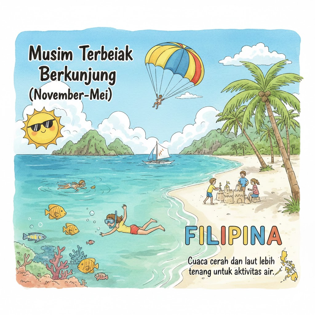 Musim kering (NovemberβMei) adalah waktu terbaik untuk menikmati wisata Pilipina. Cuaca cerah dan laut lebih tenang untuk aktivitas air.